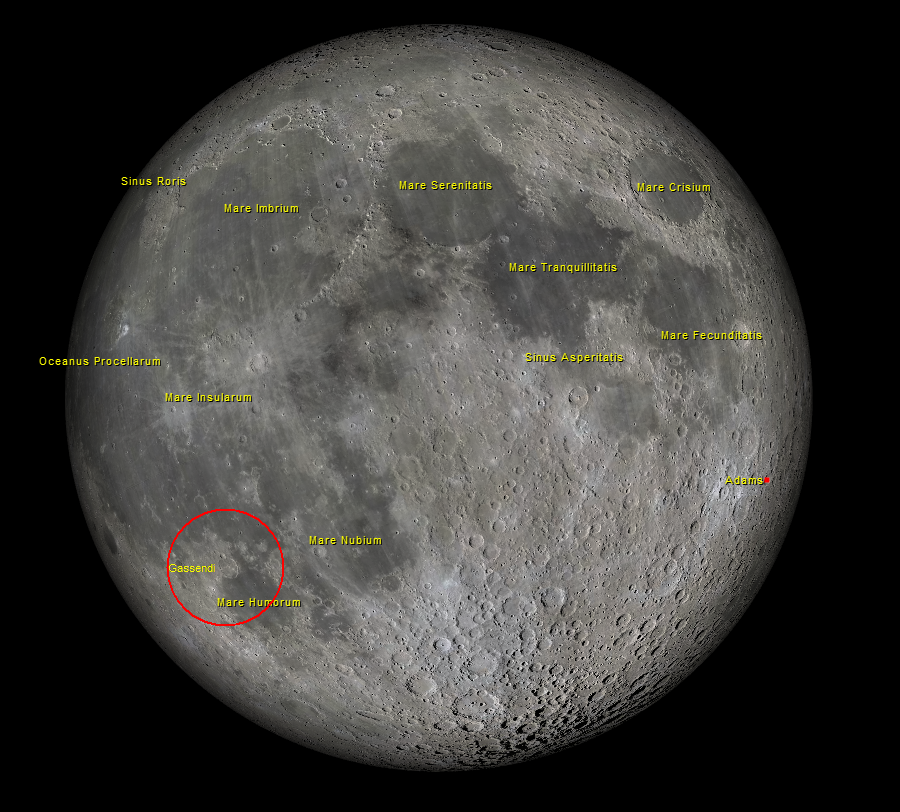 Le cratère Gassendi est l’un des reliefs lunaires les plus remarquables et les plus étudiés du bord occidental de la Lune. D’un diamètre d’environ 110 kilomètres, il se situe à la limite nord de la Mer des Humeurs (Mare Humorum), une vaste plaine basaltique formée par d’anciennes coulées de lave.