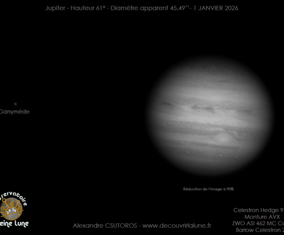 Première séance d’imagerie de Jupiter avec le Celestron Edge HD 9.25, réalisée le 1er janvier 2026 dans des conditions hivernales froides mais favorables. Malgré une turbulence encore présente et une prise en main en cours du tube, les images révèlent déjà les principales structures atmosphériques de la planète, dont la Grande Tache Rouge. Alexandre CSUTOROS